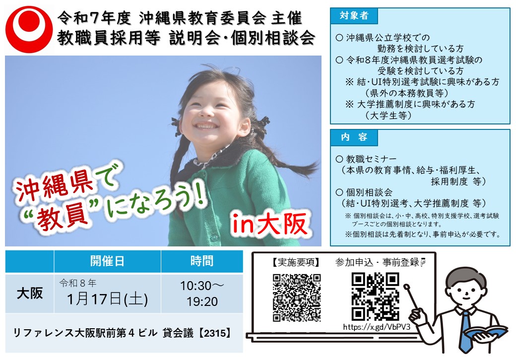 沖縄県教育委員会が主催する『教職員採用説明会・個別相談会』が【大阪】で開催されます。