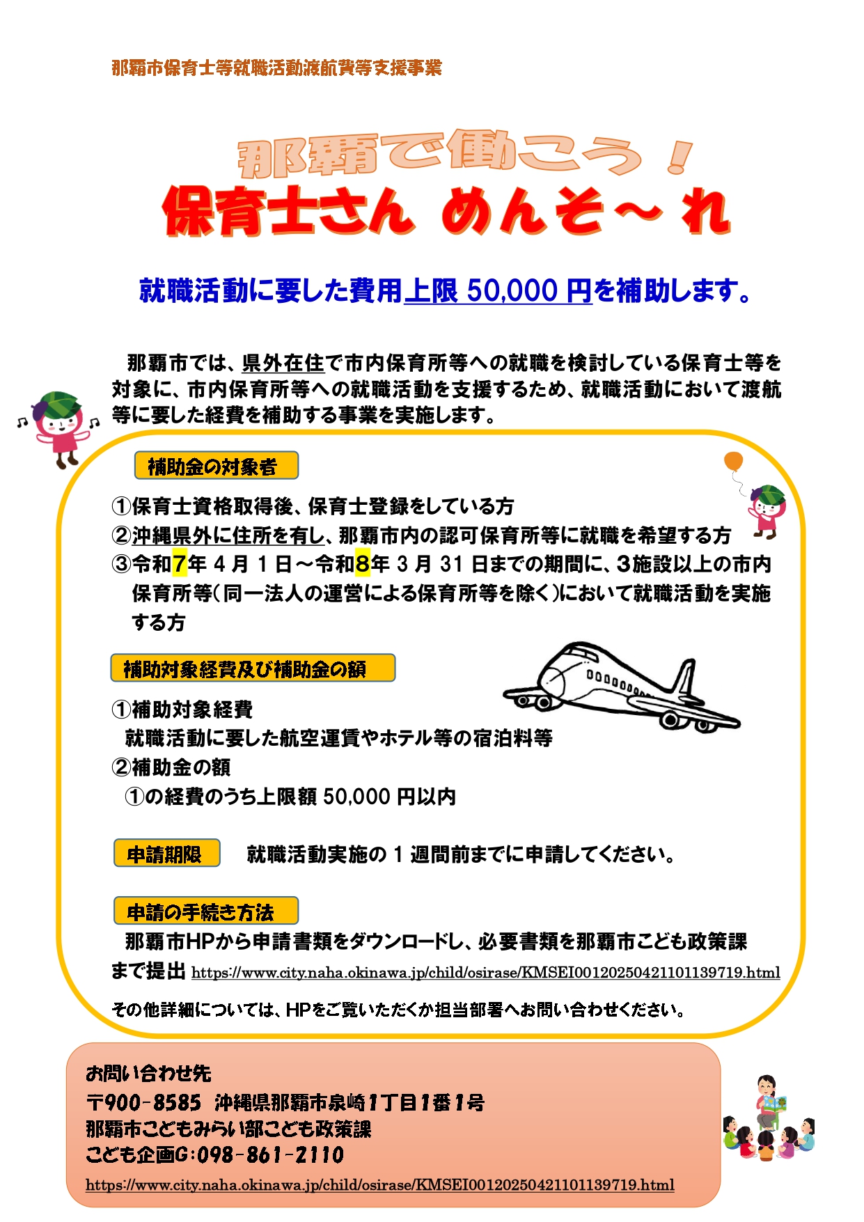 沖縄県内における慢性的な保育士不足の解消の一助として、那覇市内の保育所等への就職を検討している県外在住の保育士の皆様を対象に、就職活動のため渡航等に要した費用を支援します。