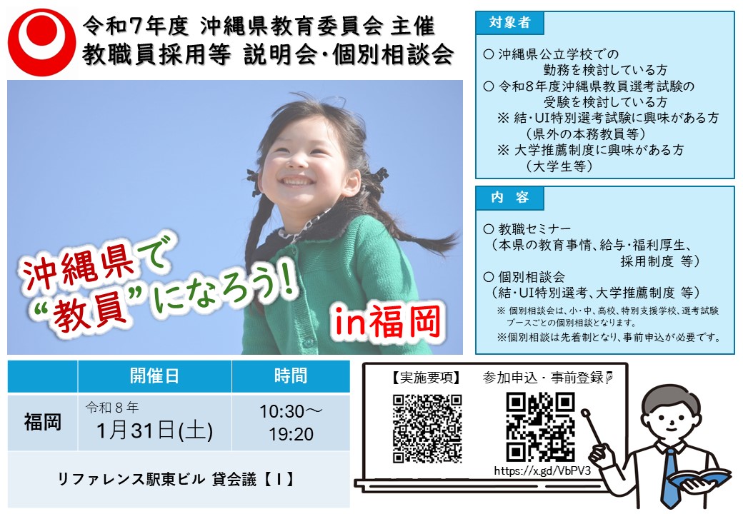 沖縄県教育委員会が主催する『教職員採用説明会・個別相談会』が【福岡】で開催されます。