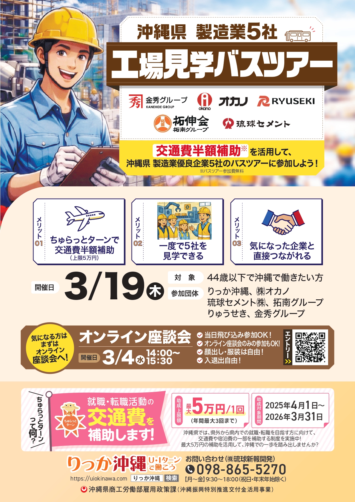 【交通費半額補助】沖縄県製造業5社 工場見学バスツアー開催!(3/19)